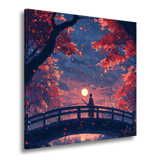 Leinwandbild Anime XXL – Einsamer Krieger auf Brücke im roten Herbstmondlicht