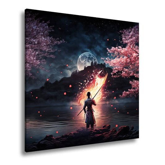 Leinwandbild Feuerlanze und Kirschblüten im Schein des vollen Mondes.