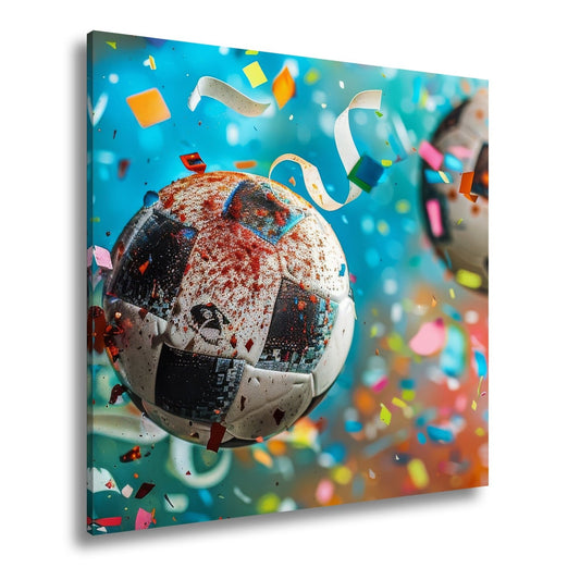 Leinwandbild Bunte Jubelszenen wirbeln um fliegende Fußbälle