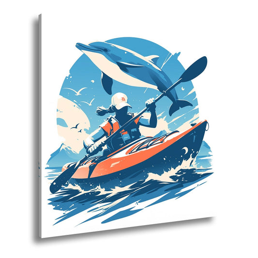 Leinwandbild Delfin springt hoch, Paddler zieht ruhig seine Bahn