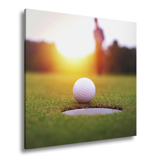 Leinwandbild Golfball vor dem Ziel – Spannung im Licht des Sonnenuntergangs
