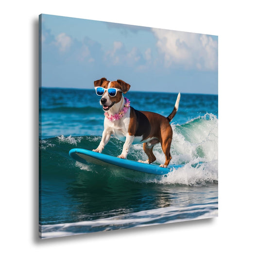 Leinwandbild Surf-Hund XXL – Cooler Hund reitet lässig die Wellen