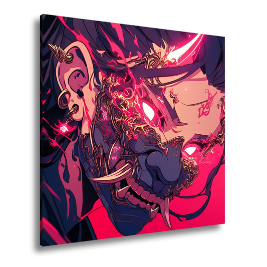 Leinwandbild Dämonische Energie entlädt sich in flammender Maskenwut.