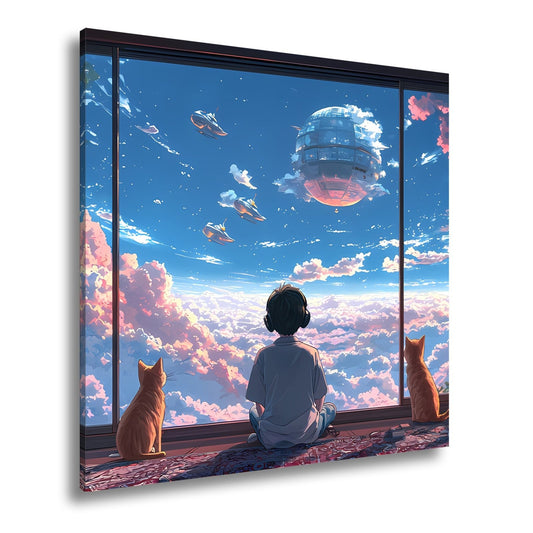 Leinwandbild Ein Junge träumt mit Katzen vom Himmel voller Zukunft.