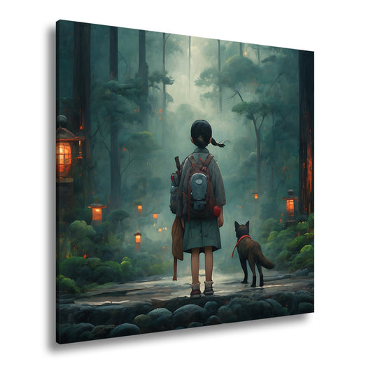 Leinwandbild Ein Kind mit Hund im leuchtenden Wald der Stille.