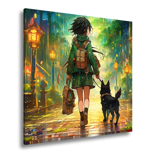 Leinwandbild Ein Mädchen mit Hund auf leuchtendem Pfad ins Wunder.