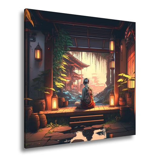 Leinwandbild Ein Mönch ruht, wo Laternen flackern und Zeit stillsteht.