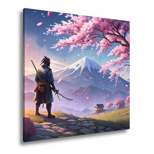 Leinwandbild Ein Samurai blickt auf Fuji-san, umhüllt von Blütenpracht.