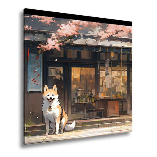 Leinwandbild Ein treuer Hund wacht vor dem Laden im Kirschblütenwind.
