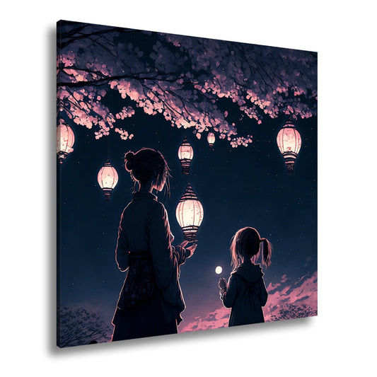 Leinwandbild Laternen schweben durch die Nacht unter Kirschblüten.
