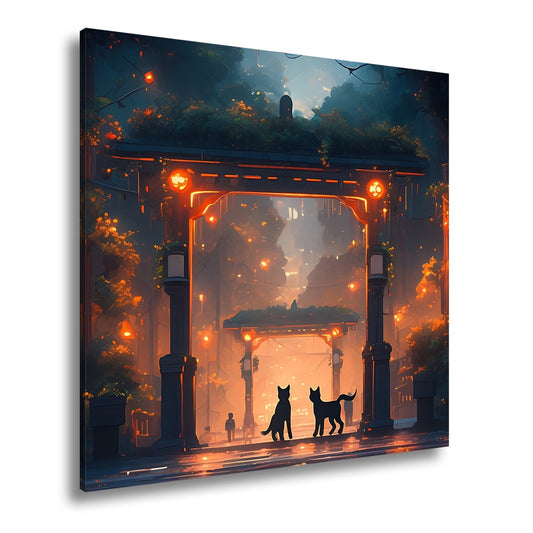 Leinwandbild Zwei Katzen im Glanz magischer Tore bei Dämmerung.
