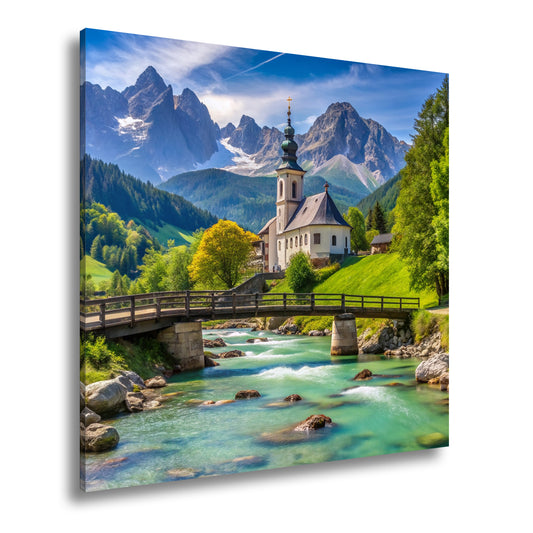 Leinwandbild Alpenidylle mit Kirche, Brücke und türkisblauem Bach.