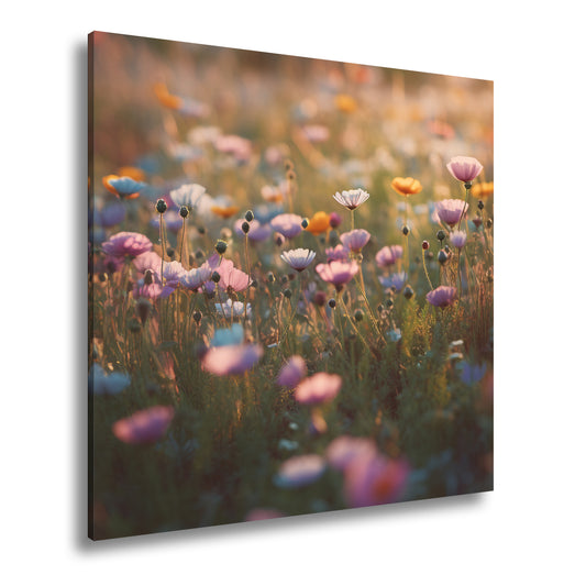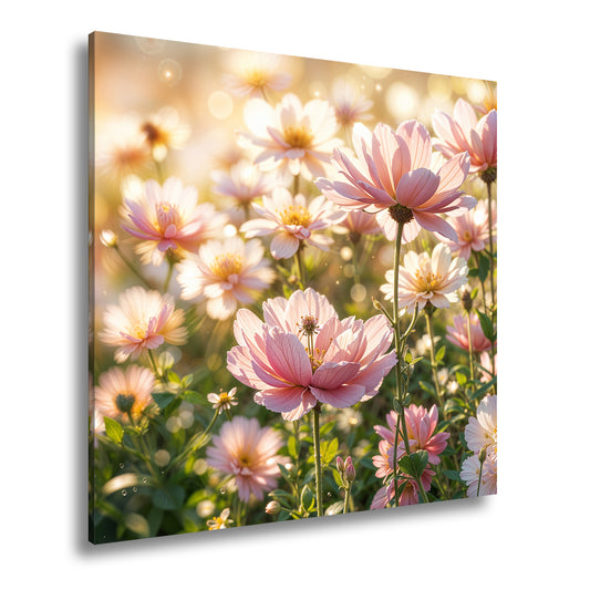Leinwandbild Sonnenstrahlen fluten ein Meer aus leuchtenden Blüten.