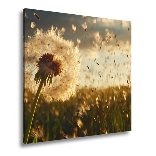 Leinwandbild Pusteblume im Flug – flüchtige Träume im Abendlicht.