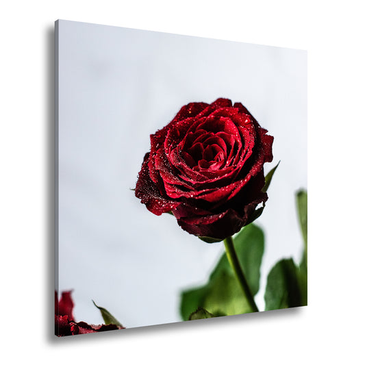 Leinwandbild Rubinrot in Tau – die Rose als Sinnbild zarter Leidenschaft.