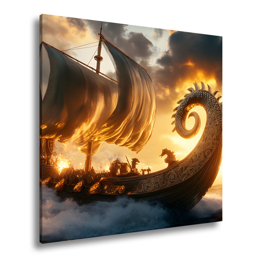 Leinwandbild Wikingerdrache XXL – Stürmt golden in den Sonnenuntergang