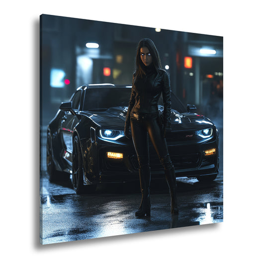 Leinwandbild Muscle Car XXL – Cyberfrau im Neonlicht vor heißem Sportwagen