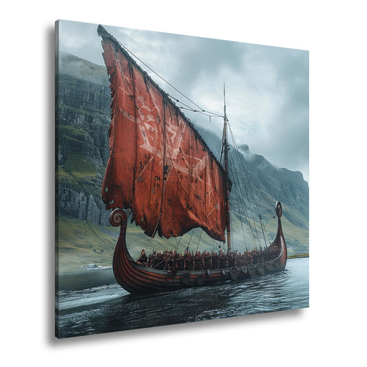 Leinwandbild Kriegerboot mit rotem Segel vor rauen Nebelklippen