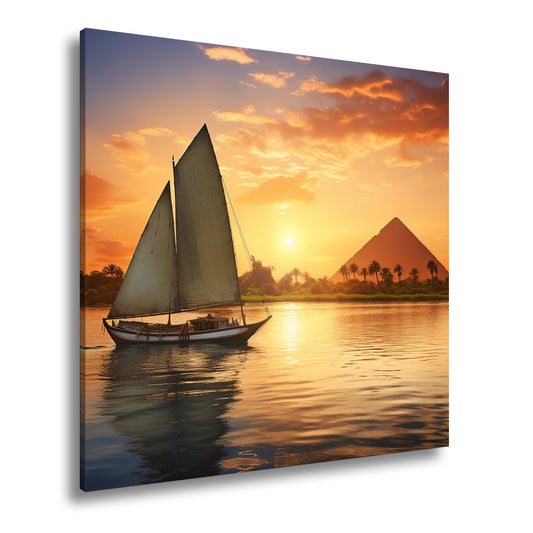 Leinwandbild Pyramidenblick – ein Boot gleitet durchs goldene Licht