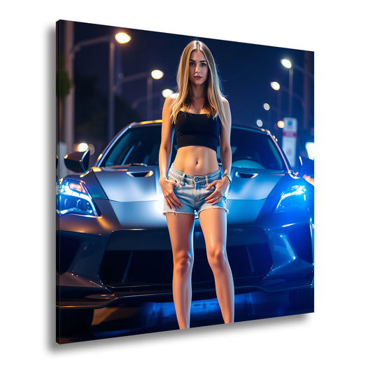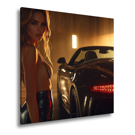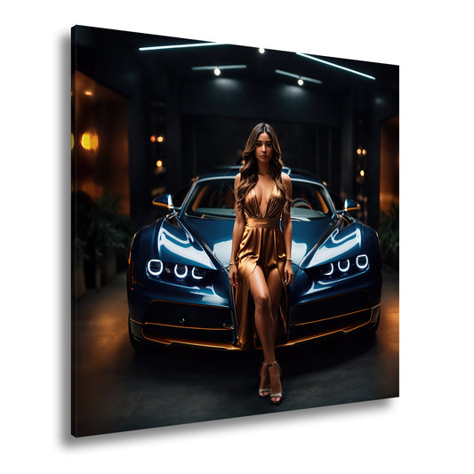 Leinwandbild Eleganz in Gold lehnt an einem nächtlich funkelnden Supersportler