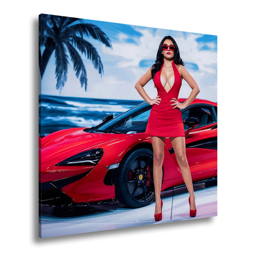 Leinwandbild Roter Sportwagen und Frau in Rot strahlen pure Leidenschaft