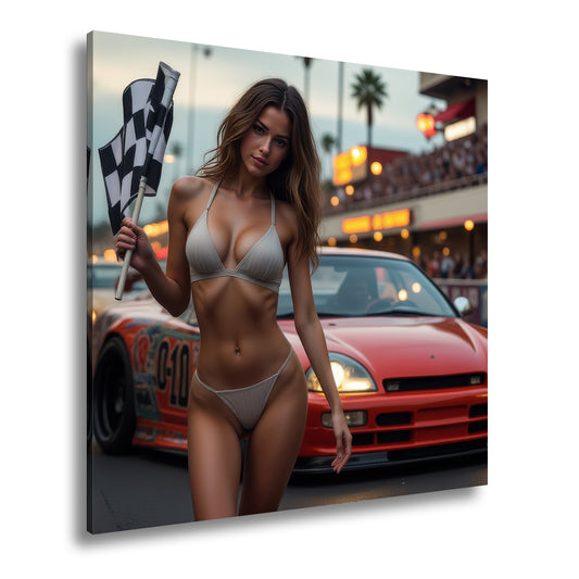 Leinwandbild Feurige Grid-Girl-Eleganz zwischen röhrenden Motoren