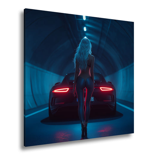 Leinwandbild Neonblaues Tunnellicht trifft auf kraftvolle Eleganz eines Sportwagens