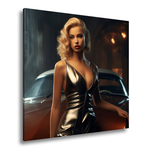Leinwandbild Golden schimmernde Diva vor einem klassischen Traumwagen