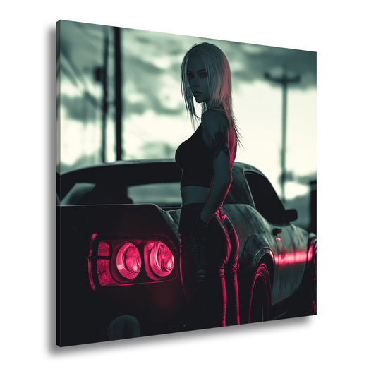 Leinwandbild Neonlicht umhüllt eine geheimnisvolle Frau vor ihrem Muscle Car