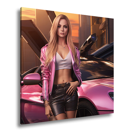 Leinwandbild Stylische Frau posiert selbstbewusst vor ihrem glänzenden Sportwagen