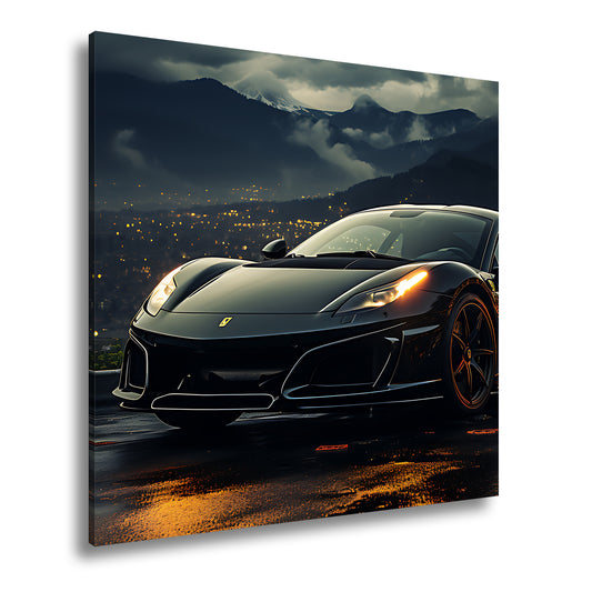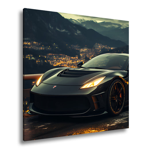 Leinwandbild Nacht und Glanz – schwarzer Supersportler vor Bergsilhouette.