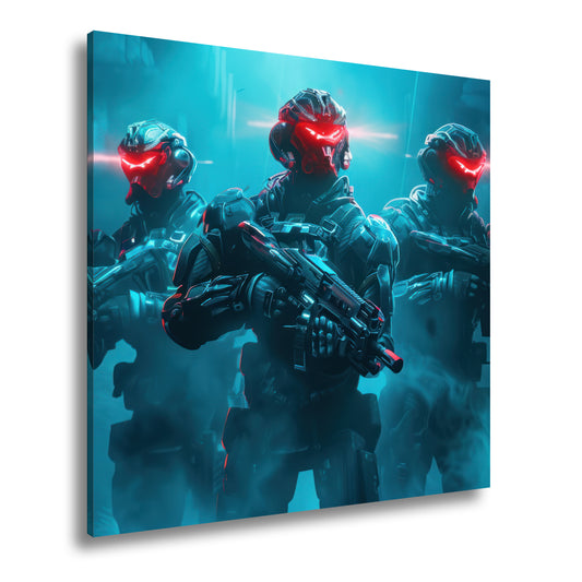 Leinwandbild Krieger der Zukunft – leuchtende Helme im Nebel des Kriegs.