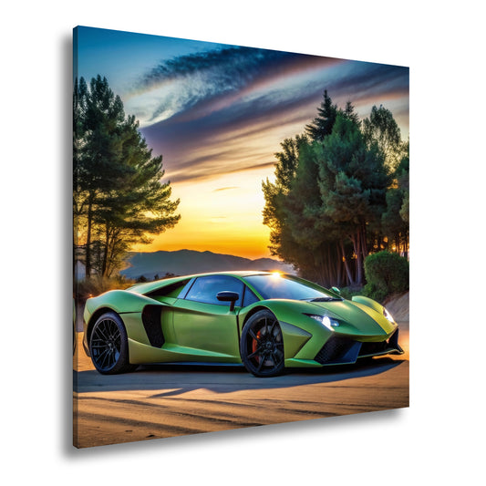 Leinwandbild Grüner Blitz – Supersportwagen im Glanz des Sonnenuntergangs.