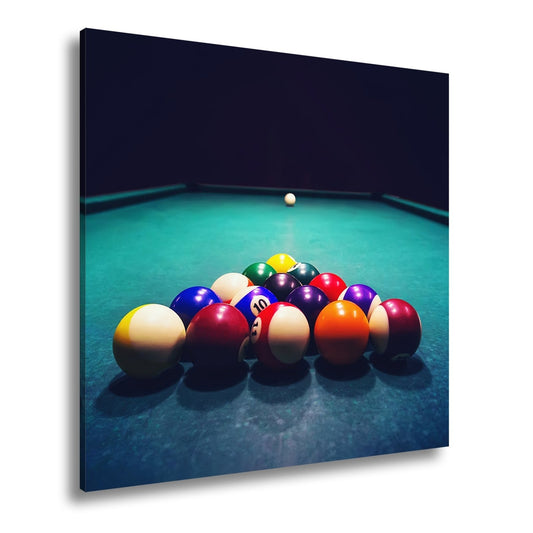 Leinwandbild Buntes Kugeldreieck wartet still auf den ersten Stoß