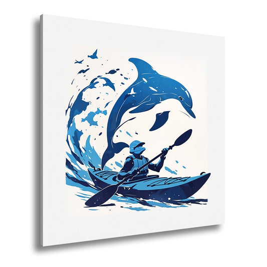 Leinwandbild Delfin springt hoch, Paddler zieht ruhig seine Bahn
