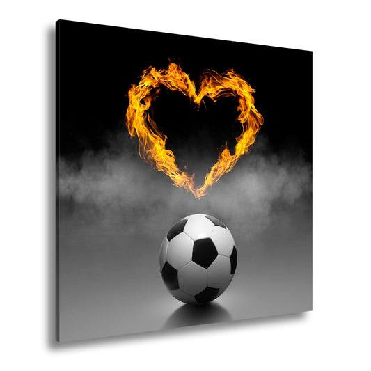 Leinwandbild Fußballliebe brennt – Herz aus Flammen über dem Spielball.