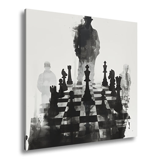 Leinwandbild Schachfiguren im Schatten eines geheimnisvollen Spielers