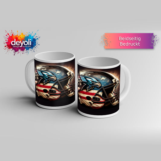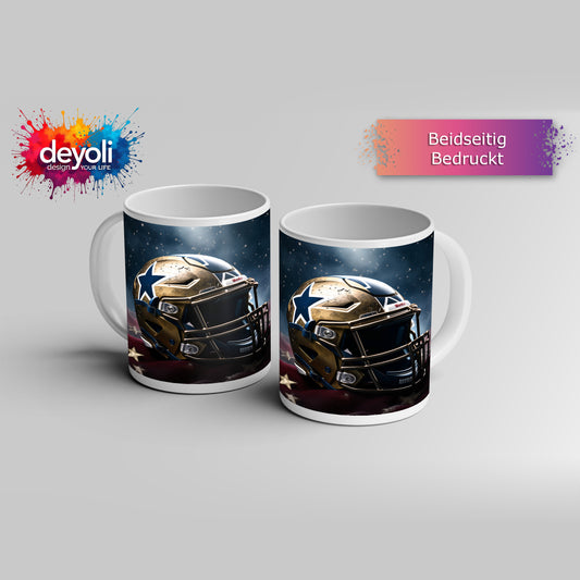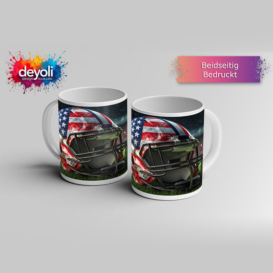 Motivtasse Helm in Sternen und Streifen – bereit für den großen Wurf.