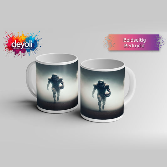 Motivtasse Konzentration und Kraft – Footballspieler im Moment vor dem Sturm.