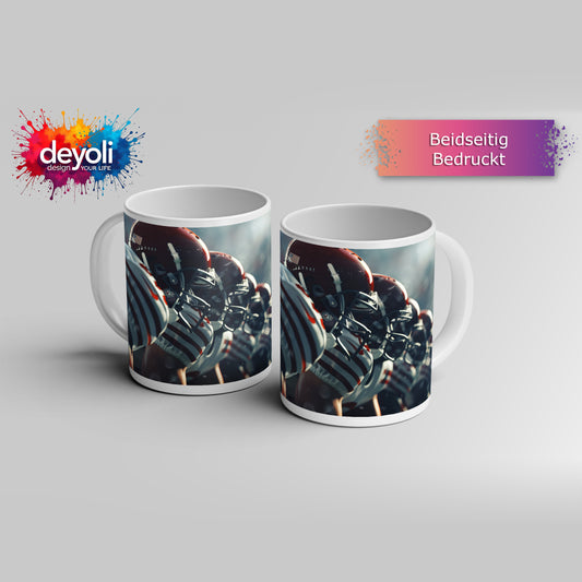 Motivtasse Helm und Ball – bereit fürs große Spiel.