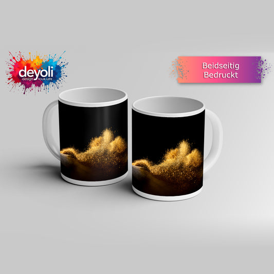 Motivtasse Gold und Schwarz tanzen in schimmernder Harmonie.