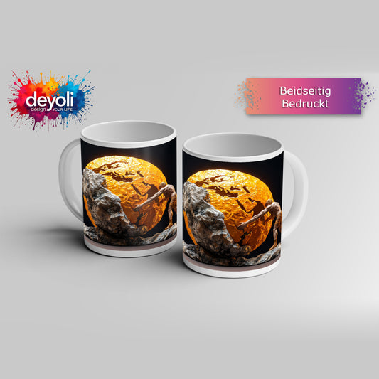 Motivtasse Atlas des Feuers – ein Held stemmt die Glut der Erde.