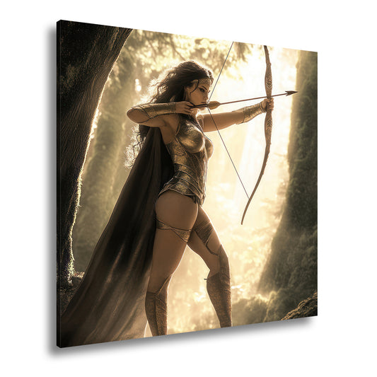 Leinwandbild Kriegerin XXL – Zielt im goldenen Licht des Waldes