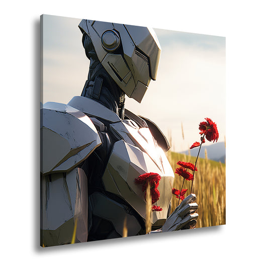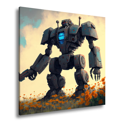 Leinwandbild Fantasy XXL – Gigantischer Kampfroboter im Blütenmeer