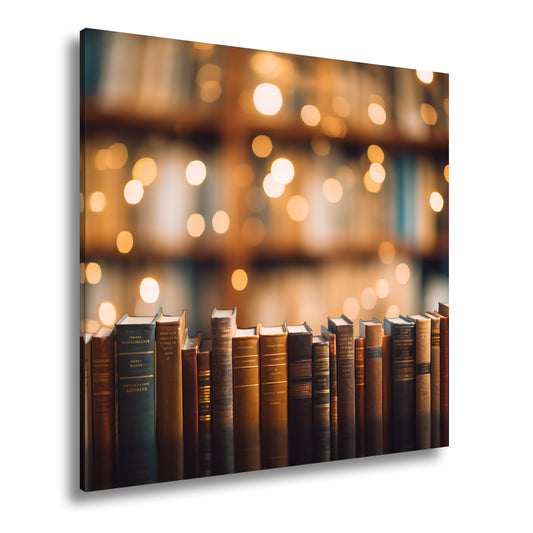 Leinwandbild Alte Bücher – Warm im Zauber der Bibliothekslichter XXL