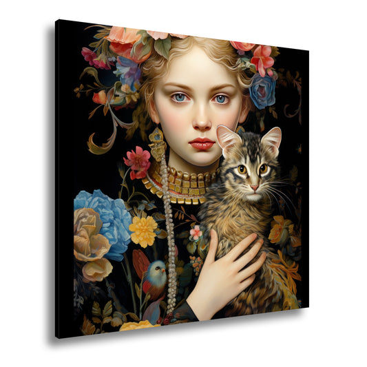 Leinwandbild Blütenkrone und Katze umrahmen ein still leuchtendes Mädchen