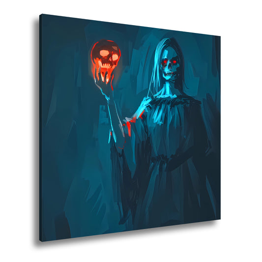 Leinwandbild Dunkle Gestalt erhebt einen glühenden Totenschädel