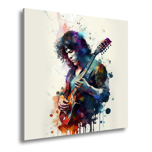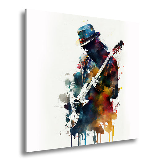 Leinwandbild Gitarrist in farbintensiver, fließender Aquarellsilhouette