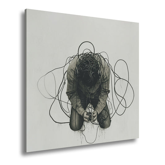 Leinwandbild Gefesselt im Kabelchaos kniet ein Mensch in stiller Last