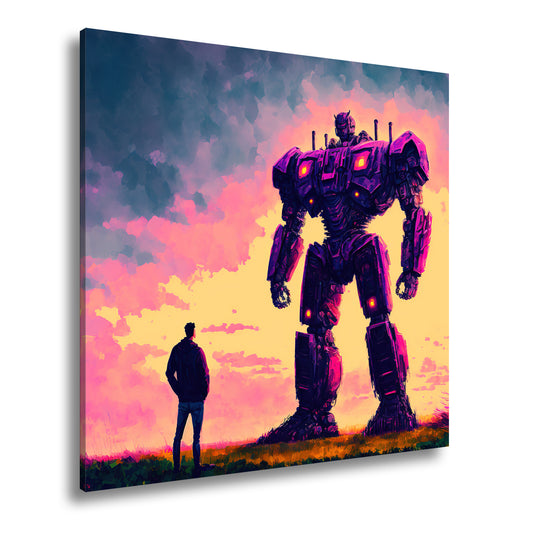 Leinwandbild Mensch und Gigant begegnen sich im flammenden Abendhimmel